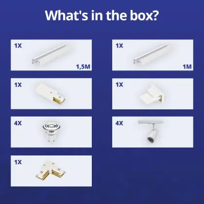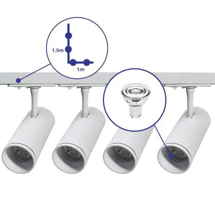 Beschrijving Bright Choice Complete Set 1-Fase Rail L 1 x 1,5 Meter Wit | incl. 4x Spot + GU10 2700K 3W Dimbaar + Eindkap, Voedingsconnector en L -Verbindingsstuk