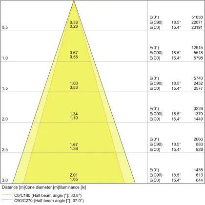 De lichtopbrengst en de gradenbundel spelen een grote rol. Zo geeft de lichtopbrengst van 5400 Lumen in combinatie met de 38° stralingshoek deze inbouwspot een specifieke toepassing. Kort samengevat is een lichtintensiteit van maximaal 400 Lumen ideaal voor accentverlichting, terwijl hogere waardes goed gebruikt kunnen worden als basisverlichting. Over het algemeen geldt: hoe breder de gradenbundel, hoe geschikter deze is door basisverlichting. Dit komt doordat het licht over een groter oppervlak wordt verspreid. Smallere gradenbundels (tot 40°) kunnen echter bij hoge plafonds ook goed tot hun recht komen als algemene verlichting.